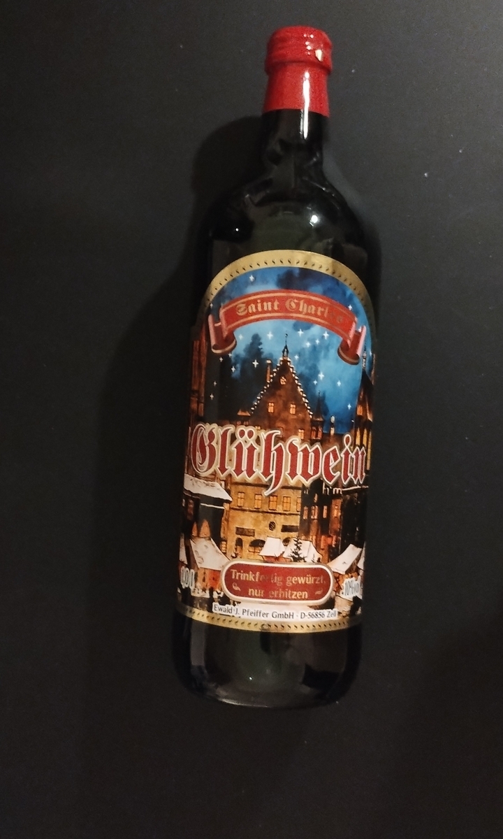 「セント・チャールズ グリューワイン(赤/甘口)」という記載があります。クリスマス当日に開栓してマグカップに注いで電子レンジであっためて飲んでみようと思います。