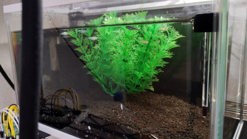 学習して水槽をたたくと餌を投入する蓋のしたに集まってきます。