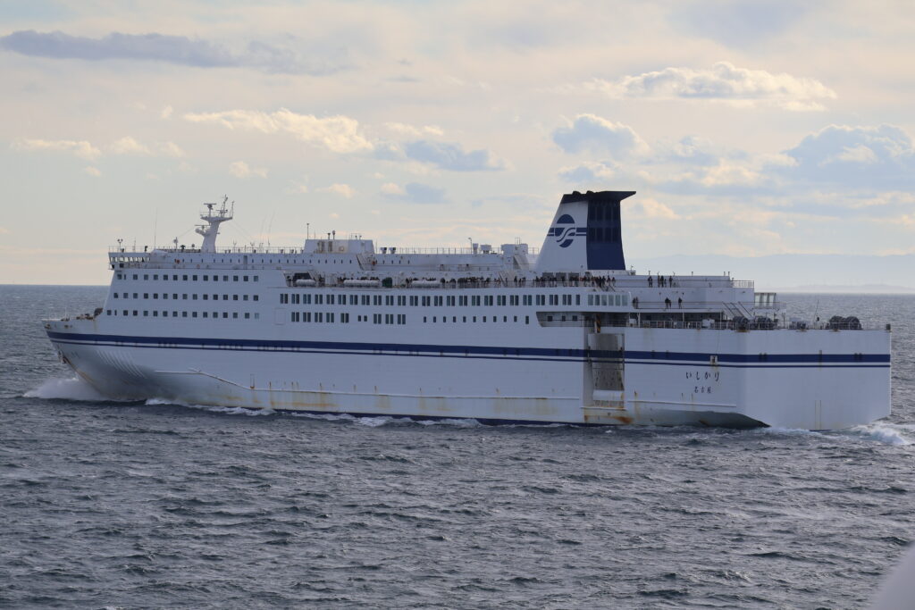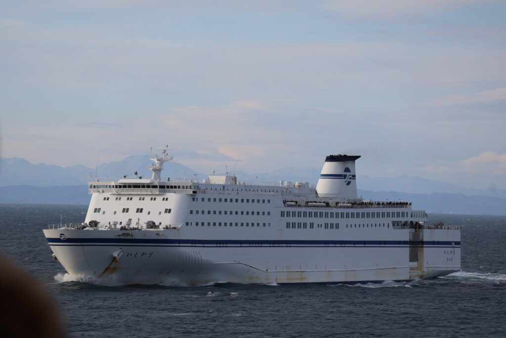 14:35にいしかりとすれ違うという船内放送があり再度スカイデッキへ。たくさんの人が既に集まっており、写真撮るスポットがなかなか見つからず…。急いで望遠レンズに変えて、人と人の間に差し込むようにカメラを構えてなんとか撮れました。