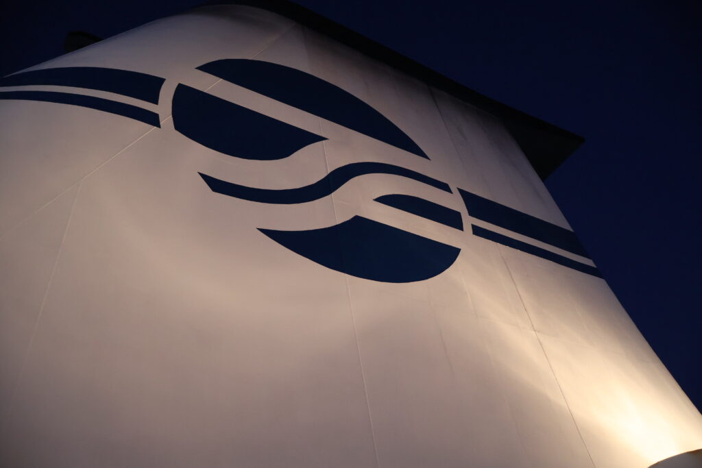 肉眼ではわかりづらかったけど、望遠レンズで撮影した画像を後で見てみるといしかりのスカイデッキにも人がずらり。風が強かったのですれ違った後はすぐに船内へ。