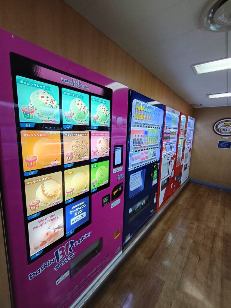 仙台港を出港した後、甘いものが食べたくなったので自販機コーナーでサーティワンカップをたべました。スプーンは取り出し口に大量におかれてました。最初にポッピングシャワーを、次にベリーベリーストロベリーをパクリ。